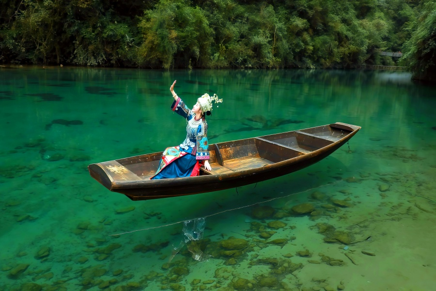 Enshi Pingshan Canyon, small boats suspended in the still lake water