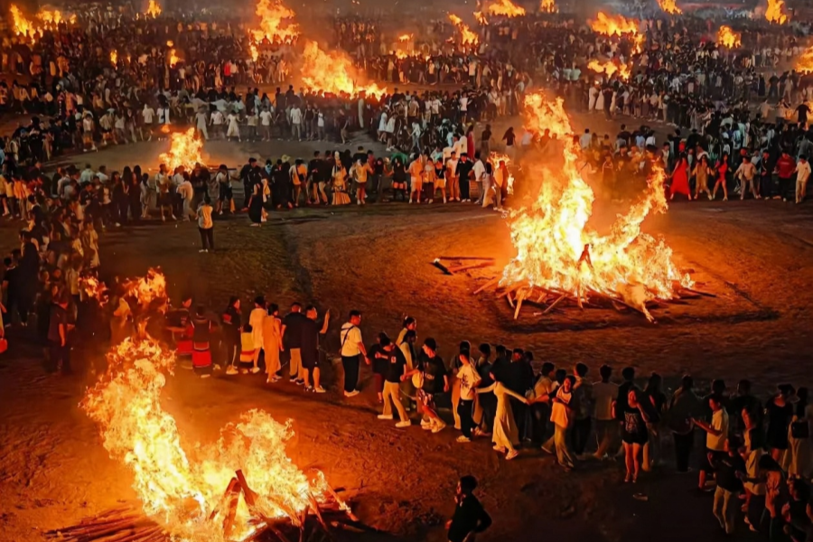 Naxi Torch Festival, people dance around the bonfire