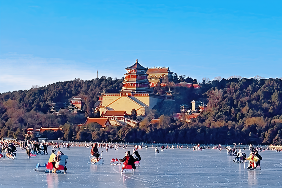 People are skating at the Royal Ice Rink in the Summer Palace